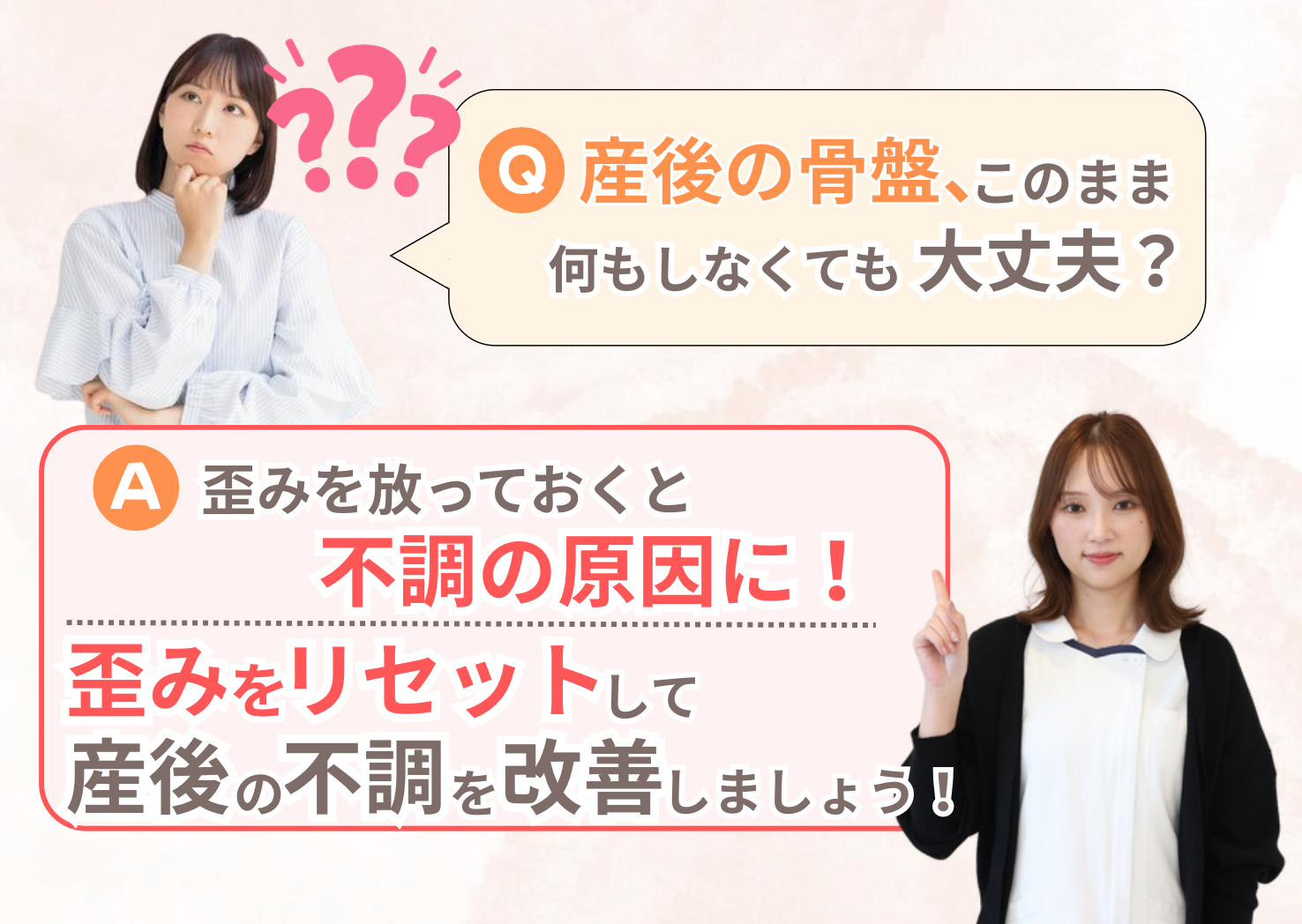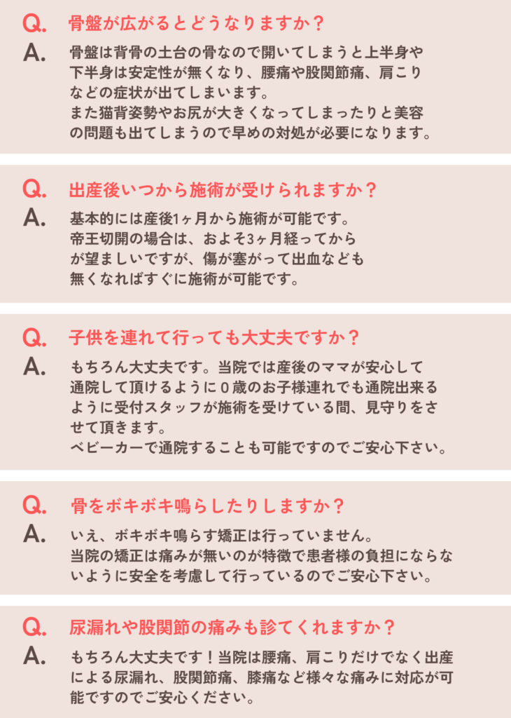 出産により土台である骨盤が開くと、背骨のズレや骨格の捻れが生じてしまい、痛みや倦怠感に繋がります。また代謝が悪くなるので体型や臓器に影響がでて、不調につながることもあります。